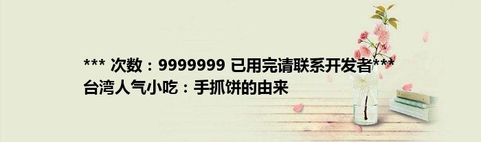 本文*** 次数:9999999 已用完请联系开发者*** 台湾人气小吃:手抓饼的由来到此分享完毕,希望对大家有所帮助。