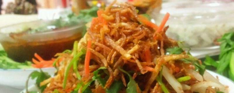 最佳答案用料:土豆2个、食用油、盐、白糖、白醋、葱、香菜。1、土豆擦成丝后过水冲洗,冲到水清没有白色沉淀为止,控水备用。2、锅中热油,下土豆丝炸,开中火,偶尔要用筷子搅拌。3、炸到酥脆即可出锅控油晾凉。4、圆葱切丝、香菜切段,拌入炸好的土豆丝中。倒入白糖、盐、白醋拌匀即可食用。