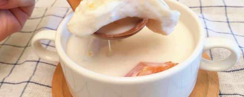 1、因为用的是白花胶,较为薄身,所以无需提前泡发,使用之前,简单的拖拖水,一分钟左右,就已完全软下来。把鲜奶倒入炖盅,将浸软的花胶煎成小块,扔进鲜奶里。