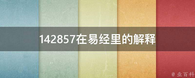 最佳答案142857在易经中被解释为一种充满动力的能量,并与成功、地位联系在一起。142857也叫走马灯数,据科学家称是发现于埃及金字塔内,是一组神奇的数字,它证明一星期有7天,它自我累加一次,就由它的6个数字,依顺序轮值一次,到了第7天,它们就放假,由999999去代替。