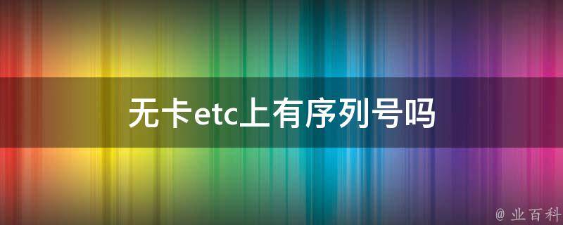 无卡etc上有序列号,可以在设备上找到,通常在设备的表面或者设备的说明书中。ETC中文翻译是电子不停车收费,通过安装在车辆挡风玻璃上的车载电子标签与在收费站ETC车道上的微波天线之间进行的专用短程通讯,利用计算机联网技术与银行进行后台结算处理,从而达到车辆通过高速公路或桥梁收费站无需停车而能交纳高速公路或桥梁费用的目的。