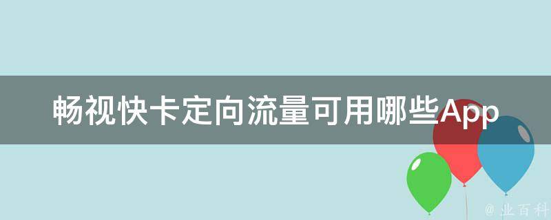 畅视快卡定向流量可以用的App有腾讯视频、爱奇艺、优酷、抖音、微信、QQ、微博等。畅视卡的流量为定向流量,只能用定向流量观看App的视频。畅视快卡月租费低,性价比高,免流量看视频,无需担心流量超标,适合经常看视频的用户。