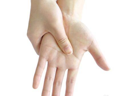 3、找到左手的大拇指和食指间陷进去的部位,用右手旋转揉捏,两手交替动作各30秒。