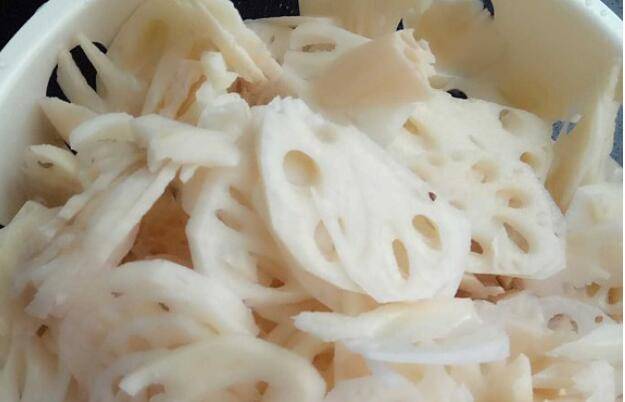2、莲藕去皮洗干净,切成薄片沥水备用。