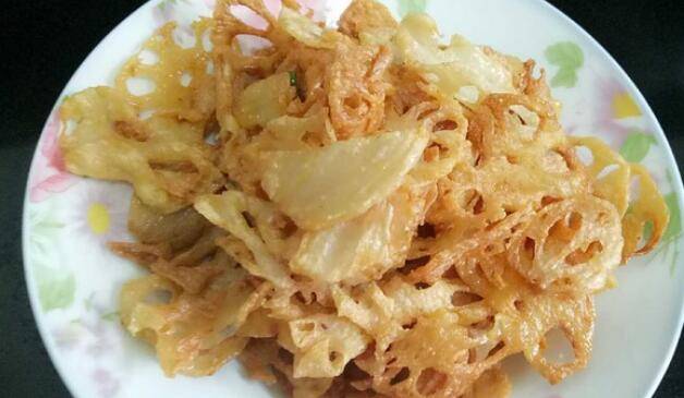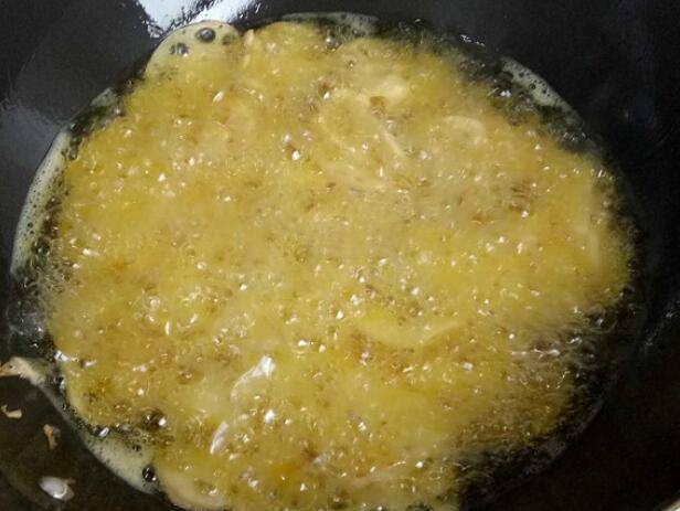 3、将油倒入锅中,待油温升高至4成时将藕片加入锅中翻炸,直到藕片颜色变为金黄色。
