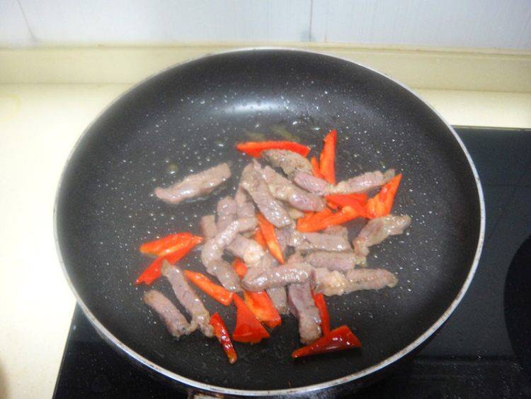 6、温油下入牛柳翻炒至变色。