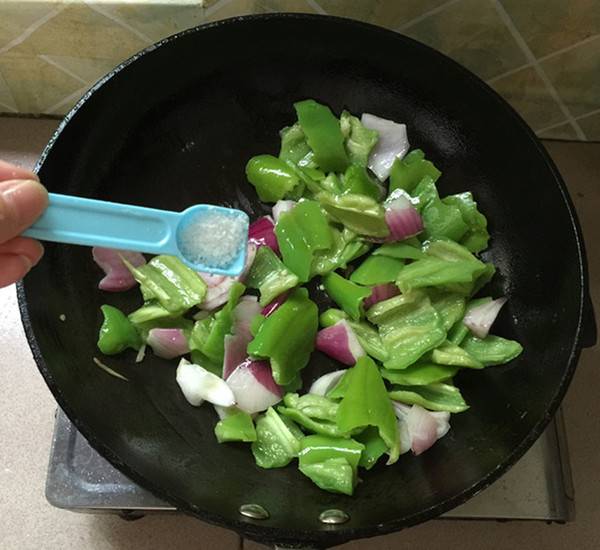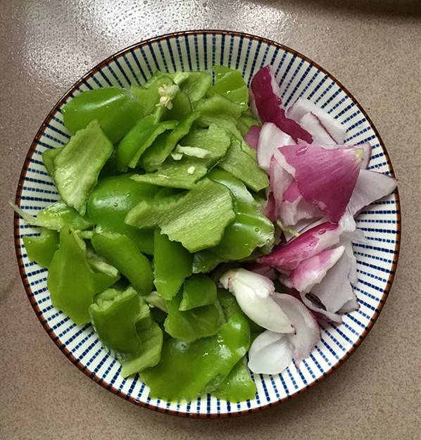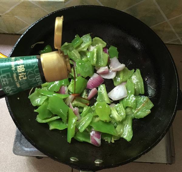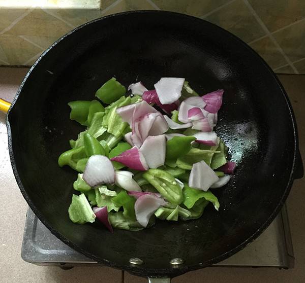 8、锅中留底油,下绿辣椒,洋葱块。