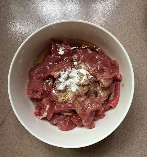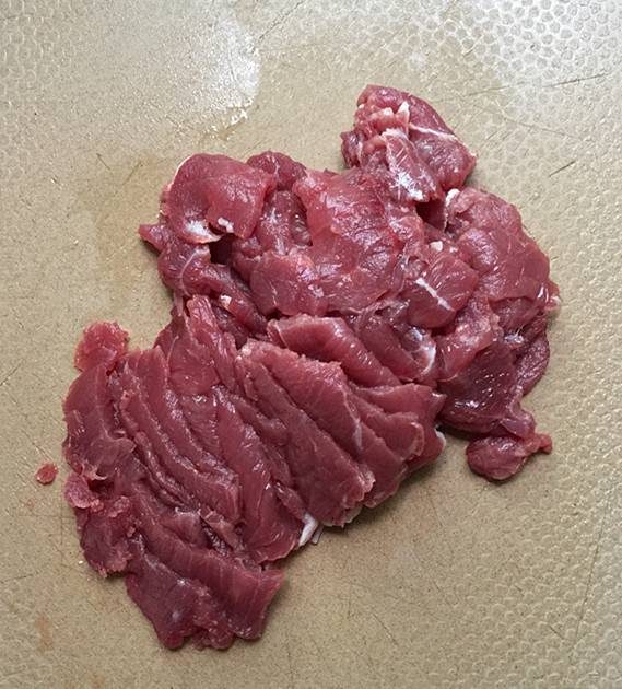 2、牛里脊肉洗净切片。