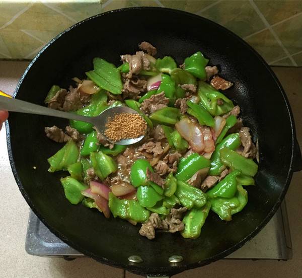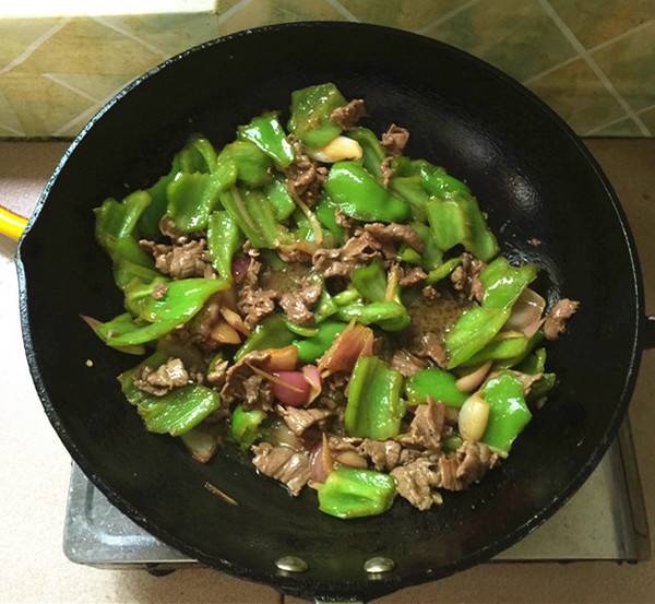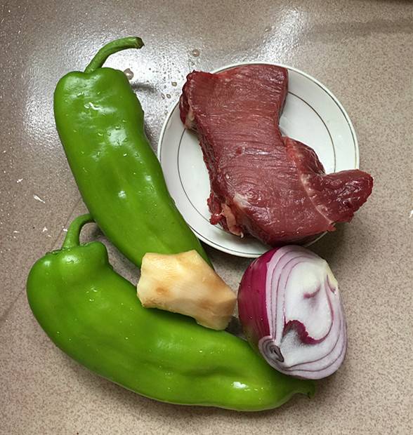 用料:牛里脊肉220克、绿辣椒200克、洋葱60克、生抽酱油10毫升、蒸鱼豉油10毫升、料酒10毫升、生粉2克、生姜5克、精盐3克、原味鲜1克、食用油30毫升。