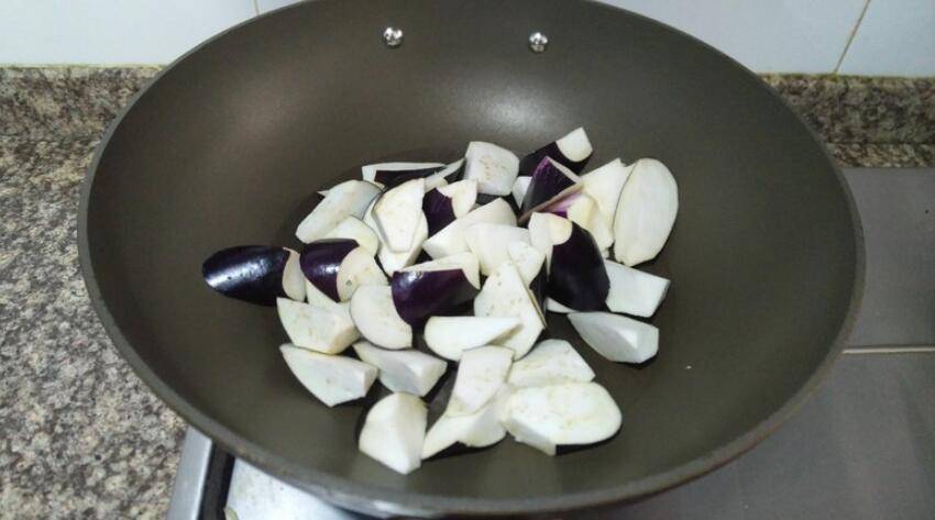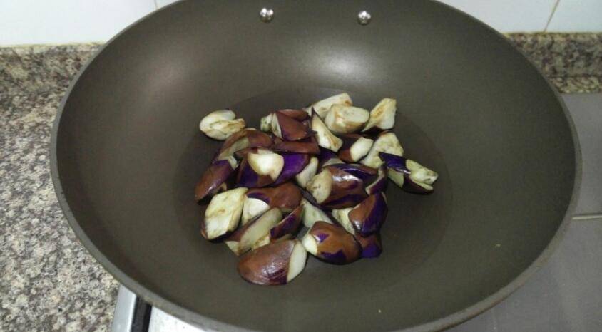 4、中小火热锅,放入茄子翻炒。