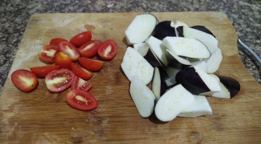 2、茄子洗净切滚刀块,小番茄对半切开。
