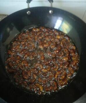 锅内放油,放入佐料、爆香放入爬蚱、撒料装盘即可。