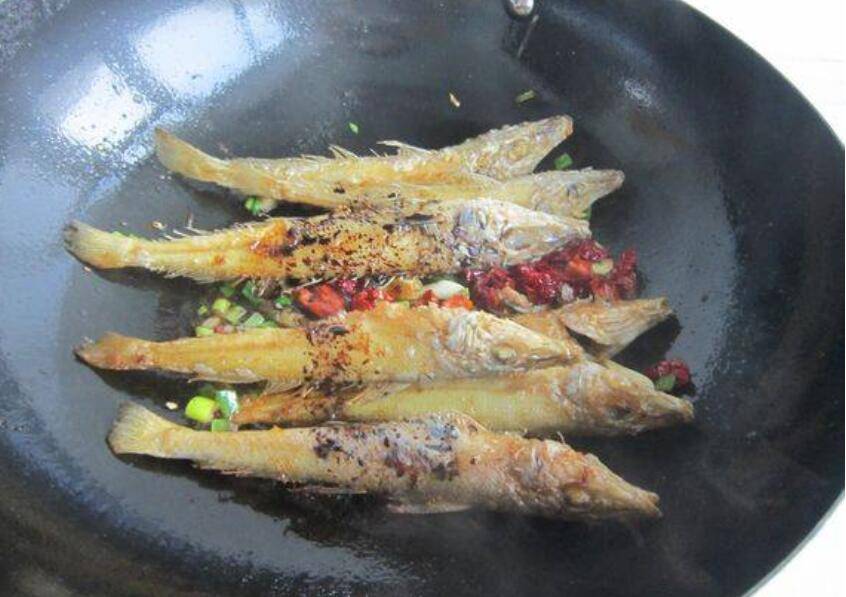 5、加葱段、蒜、姜片、花椒、八角、辣皮子、盐、炒出香味,把鱼和炒香的调料拌在一起。