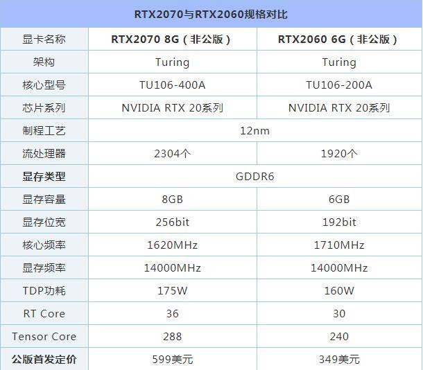 RTX 2070使用了完整的TU106-400A核心,核心频率为1620MHz,显存频率为14000MHz,搭配8GB GDDR6显存,TDP方面非公标准版为175W;而RTX 2060使用了完整的TU106-200A核心,核心基础频率1710MHz,显存频率为14000MHz,搭配8GB GDDR6显存,TDP方面非公标准版为160W。