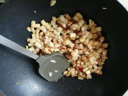 锅中加入适量的油,中小火翻炒瘦肉,加盐调下味道,炒至微干。
