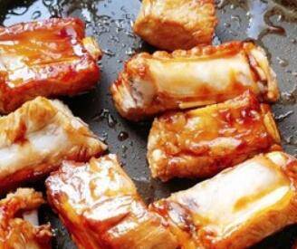 4、起锅放油加白糖,炒糖色,把排骨放进去裹上糖汁翻炒均匀。