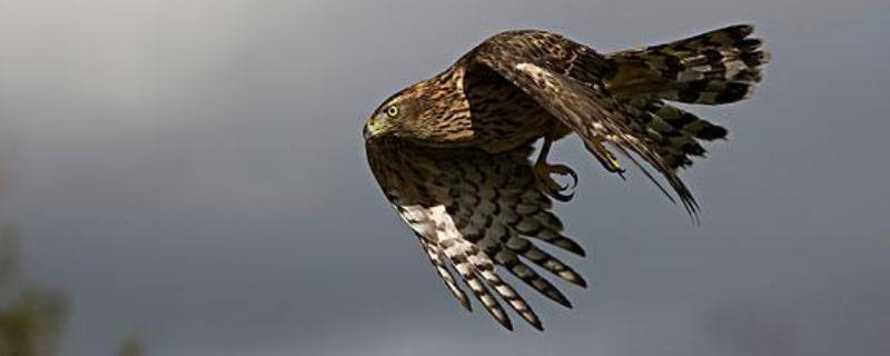 2、雀鹰:体形比苍鹰稍小,成鸟上体青灰色,尾羽较长,有十分明显的深褐色横斑,很容易识别。常栖于山地林间,或在村落附近河川小溪附近地带,飞翔力很强,善捕食小鸟等动物。