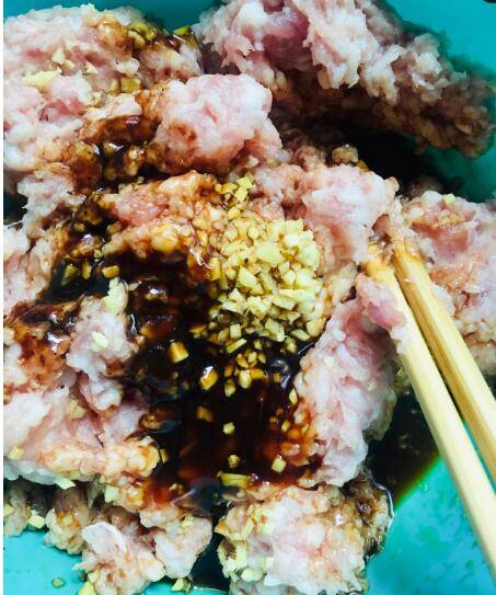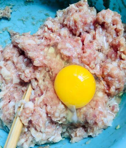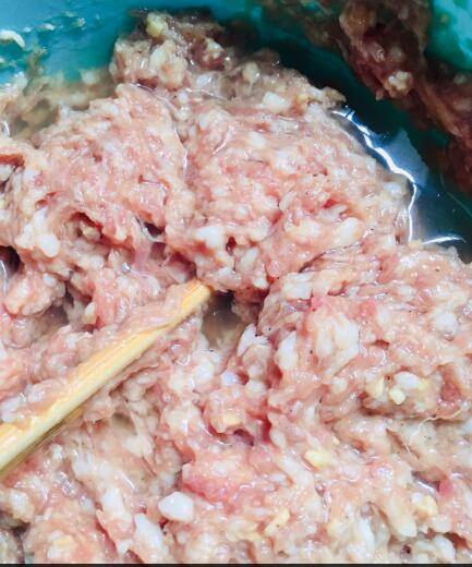 6、凉的清水分3次加入,顺着一个方向搅拌均匀,每次要等水分充足被肉吸收再加下一次水搅拌均匀。直到肉馅粘稠上劲即可。