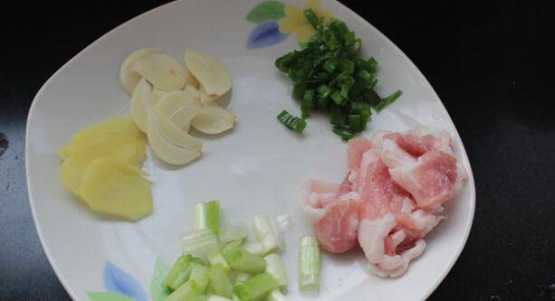 2、姜蒜切片,五花肉切片。五花肉不用太多,只是给豆腐添点油脂。葱白葱尾分开切。葱白切寸段,葱尾切成葱花。
