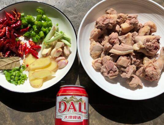 鸭腿肉700克、姜8片、蒜8颗、小米辣2颗、葱2根、八角3颗、桂皮3克、香叶4片、啤酒1瓶、干辣椒15克、尖椒2根。