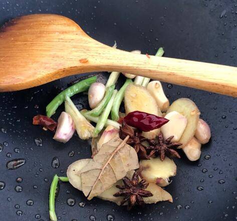 爆炒葱姜蒜香料,然后放入干辣椒和豆瓣酱小火煸香。