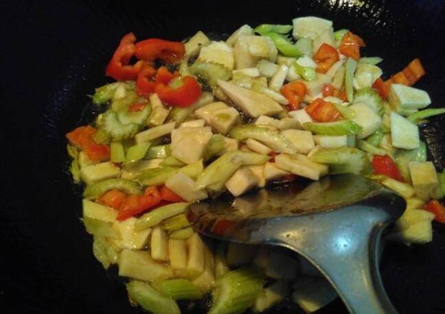 6、放入杏鲍菇翻炒。