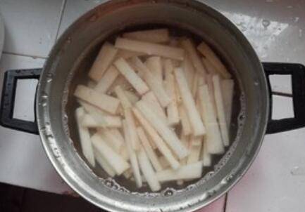 2.换了几次水后,开火煮淮山条,只要七八分钟就行了,主要是方便菜炒的时候容易熟。