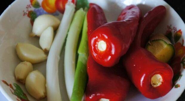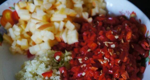 4、尖椒、大蒜切碎,切一点苹果碎。