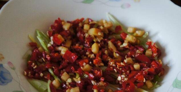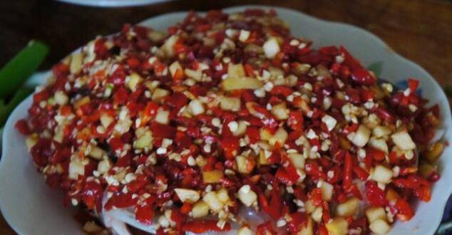7、放一层腌制好的剁椒酱。