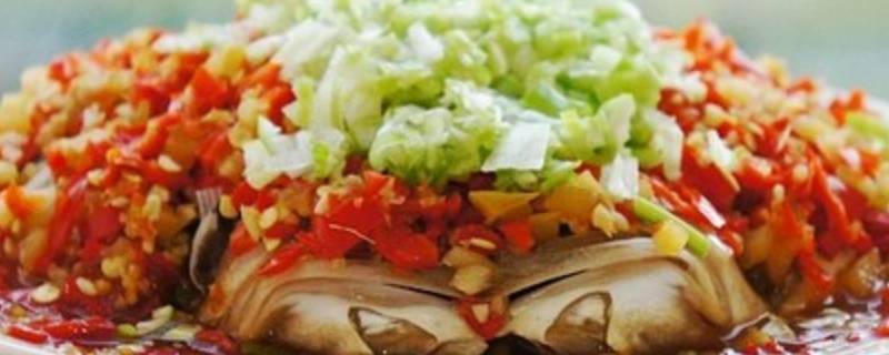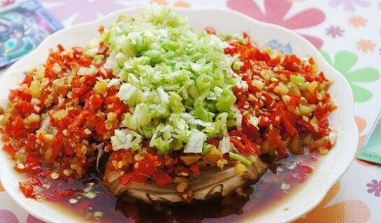 8、将腌制好的鱼头平铺在盘中,上边铺满剁椒酱,加一点蒸鱼豉油。