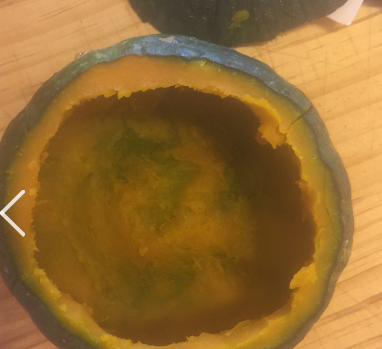 2、取出后切去顶端,将南瓜肉挖出,南瓜籽部分去掉。