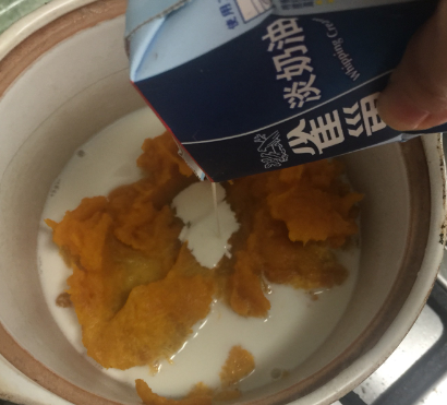 3、南瓜泥倒入锅中加入牛奶,加入淡奶油。