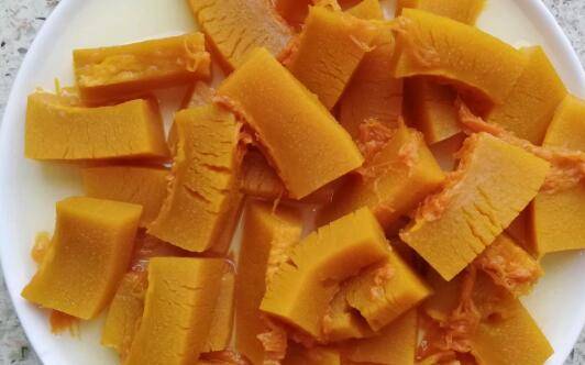 2、南瓜去皮,切成小块。将南瓜放在蒸架上,隔水蒸20分钟。