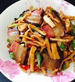 6、油下锅,将沥干水分的腊肉完全煸出油,然后捞起,装盘备用。