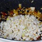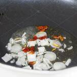 3、热锅冷油,加入葱花辣椒炒出香味。