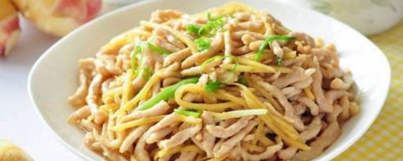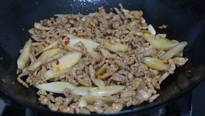 4、不停翻炒肉丝,炒至肉丝全部变色以后,放入嫩姜继续翻炒几下。