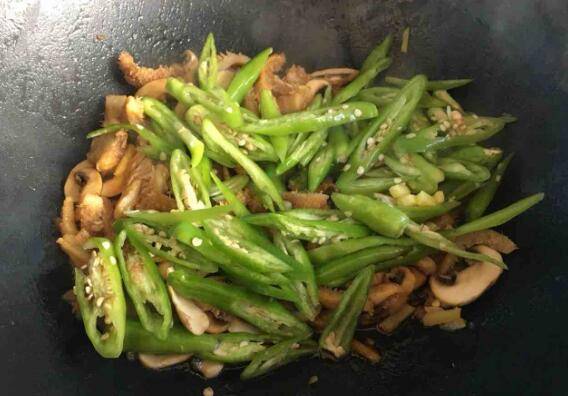 5、然后倒入辣椒,继续翻炒。