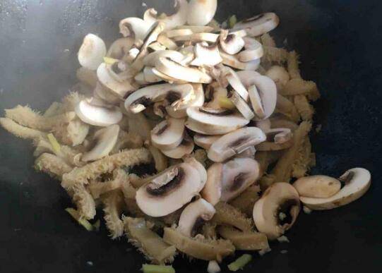 用料:熟牛肚300克、白蘑菇200克、青椒5个、生姜5克、大蒜3瓣、料酒2勺、生抽2勺、白糖半勺、盐少许、鸡粉少许。