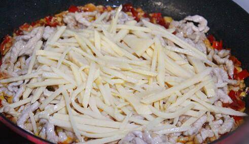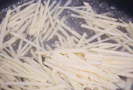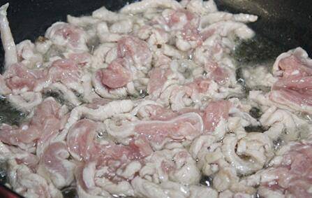 锅中加入适量的油,油热后,将肉丝放入锅中。煸炒至肉丝发白即可盛出备用。