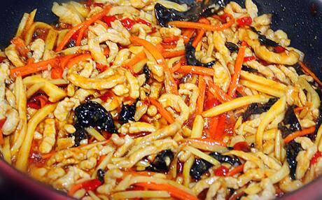 猪里脊肉300克、笋200克、水发木耳60克、胡萝卜60克、蒜适量、剁辣椒适量。