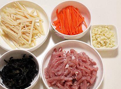 将猪肉、笋、胡萝卜、木耳切丝,蒜切末备用。