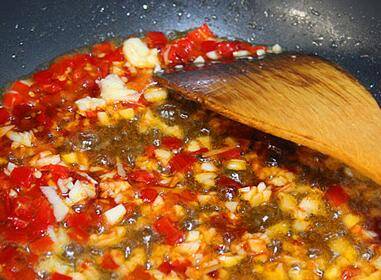 锅中留适量的底油,油热后,加入少许豆瓣酱、剁椒、蒜末炒出香味。