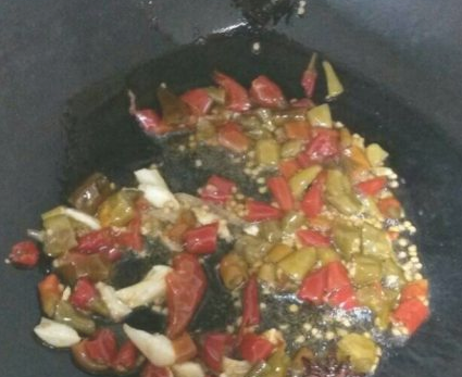 倒入油,开火,待油滚烫时依次放入花椒、八角、蒜、泡海椒;半分钟后依次再放入泡姜、泡萝卜;