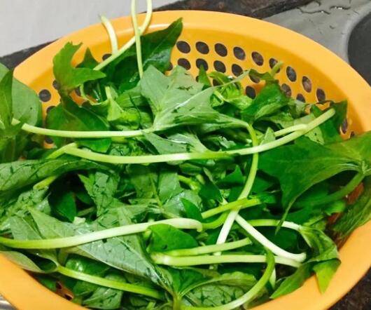 放入薯苗,翻炒至软;
