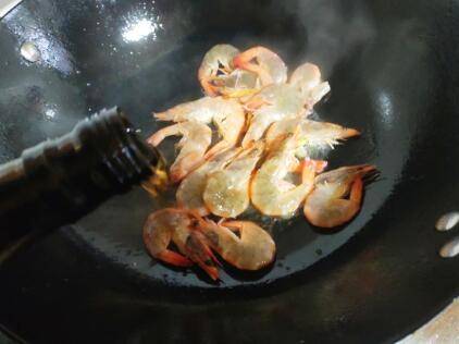 然后下入基围虾,倒入适量料酒,翻炒。