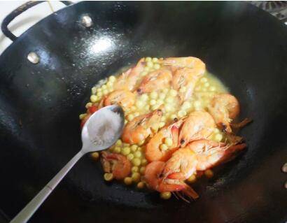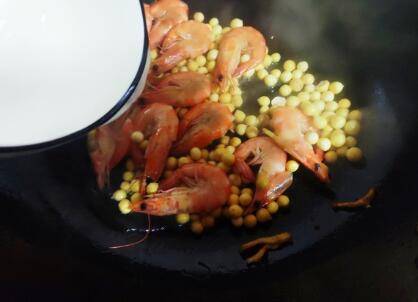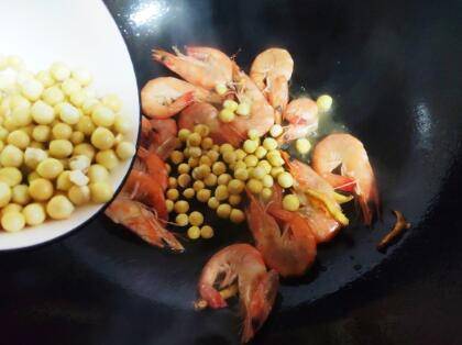 待基围虾翻炒至变红,倒入鸡头米,一起翻炒一下。