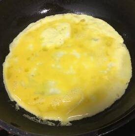 2、平底锅放一点油,鸡蛋摊成一张饼,然后用筷子拨散备用。