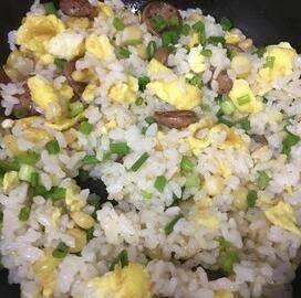 最佳答案用料:冷饭1碗、鸡蛋1个、玉米1小把、香肠1根、小葱1根。1、鸡蛋打散搅拌均匀,玉米煮熟备用,香肠切片,小葱切葱花。2、平底锅放一点油,鸡蛋摊成一张饼,然后用筷子拨散备用。3、香肠用小火煎一煎盛出备用。4、用香肠煎出来的油,翻炒冷饭。5、炒热后加入其他配料一起翻炒,然后放盐、葱花即可。