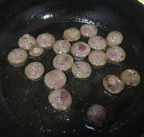 3、香肠用小火煎一煎盛出备用。