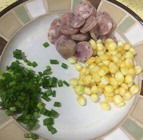 用料:冷饭1碗、鸡蛋1个、玉米1小把、香肠1根、小葱1根。
